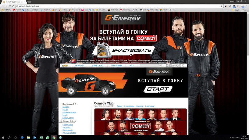 Кроссмедийный рекламный проект широко анонсировался на телеканалах ТНТ и ТНТ4: для проекта снят рекламный ролик участием резидентов Comedy Club — Марины Кравец, Дмитрия Сорокина, Андрея Аверина и Зураба Матуа, а в шоу звучали устные объявления Гарика Харламова и ведущие беседовали с приглашёнными гостями — гонщиками команды G-Energy Team.